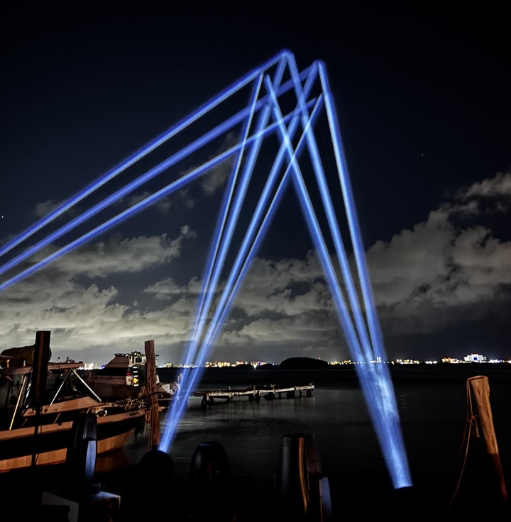 El Skylos impresionó con su potencia en disparos aéreos, proyectando haces de luz a un hotel ubicado a casi 5 km de distancia, captando la atención de los transeúntes en la zona.