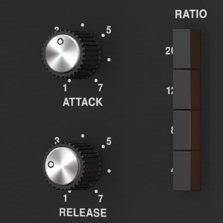 Con una interfaz de usuario sencilla de operar, el compresor ofrece tres relaciones: 4: 1 para compresión moderada; 8: 1 para compresión severa: 12: 1 para limitación leve; y 20: 1 para limitaciones duras. Además, el modo “Todo botón” está incluido para voces agresivas, siendo especialmente efectivo cuando se aplica a los micrófonos de batería, bajo, guitarra y sala.