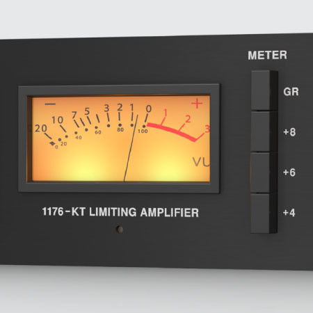 Un medidor VU iluminado estilo vintage, mantiene al 1176-KT en estilo con el procesador original Klark Teknik. El medidor aplica la confirmación visual de la reducción de ganancia y el nivel de salida según el botón del medidor seleccionado.