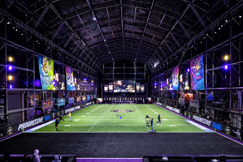 Las cabezas móviles LED Elation Proteus Maximus y los paneles de matriz LED Cuepix 16 IP proporcionaron iluminación de campo de juego, transmisión y entretenimiento para la segunda temporada de Fan Controlled Football en Pullman Yards en Atlanta.