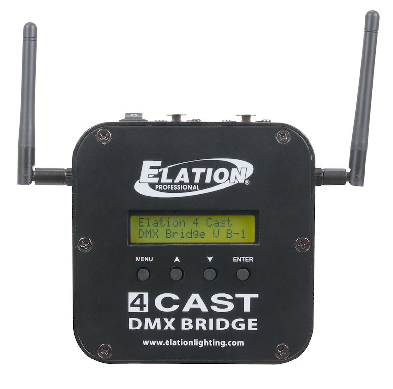 Iniciamos el paseo por el 4CAST DMX BRIDGE, el cual es un dispositivo inalámbrico de 4 universos que enlaza las señales de WiFi, Art-Net, sACN y E-FLY (solución DMX inalámbrica de Elation) para controlar de forma inalámbrica dispositivos DMX compatibles, una solución ideal para eventos de producción pequeña, clubes nocturnos, bares o cualquier otro evento o lugar que requiera de data oculta de cables.