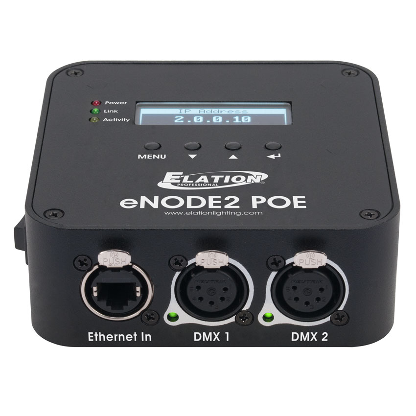 El eNode2 POE es un nodo Ethernet DMX de dos universos, alimentado por Ethernet (POE) que respalda sistemas Art-Net compatibles con control DMX que usan un autoconmutador RJ45 con entrada de 10/100Mbps Neutrik etherCON y dos salidas de datos 5pin Neutrik DMX de múltiples configuraciones. Entre las funciones se incluye soporte de conversión DMX bilateral, un panel de control de 4 botones, una visualización de menú del sistema OLED y tres indicadores de estatus LED.