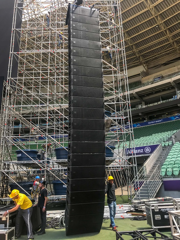 El sistema MLA de Martin Audio fue provisto por Gabisom Audio Equipment, cuyo ingeniero de sistemas Eder Moura, explica: “El concierto tuvo una audiencia de 48,000 en un área de cobertura de más de 500 pies. Utilizamos seis suspensiones, una suspensión L/R principal con 20 MLA y dos MLD. El lado L/R se cuelga con 21 MLA y un MLD, un L/R posterior se cuelga con cuatro MLA, más 16 subwoofers MLX por lado y 12 MLA Compact como front fill.
