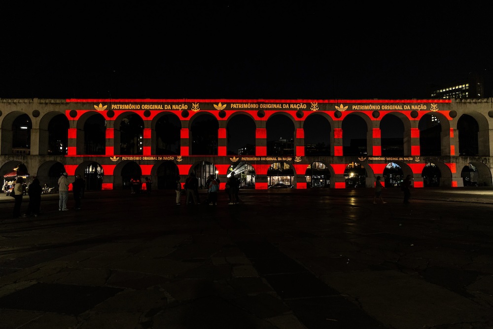 La activación, solicitada por la agencia WMS para Adidas Originals, transformó el acueducto en una pieza monumental inmersiva con los tonos rubro-negros característicos del club y la frase “Patrimônio Original da Nação”, reforzando la identidad cultural del Flamengo y su vínculo con la ciudad.