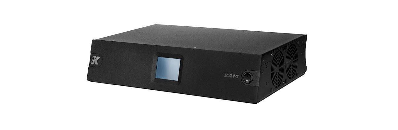 Ahora, la solución todo-en-uno amplificador y procesador KA14, presenta 1000W en 2 unidades rack, entradas XLR y RCA; 4 salidas independientes y configurables; DSP con procesador, matriz y delays integrado; pantalla táctil y conexión USB para control remoto; que lo hacen ideal para refuerzo de sonido en teatros, slas de concierto, clubes, templos, sonido envolvente y efectos para cines, entre otros. El KA14 es un amplificador fácilmente adaptable para aplicaciones pequeñas que no requieran de mucha potencia, siendo un sistema completo con un mezclador, procesador y amplificador.