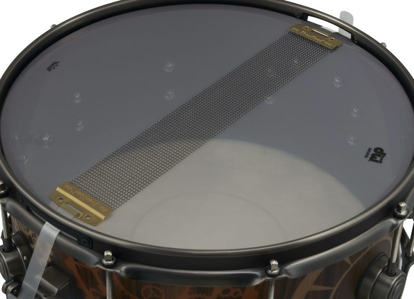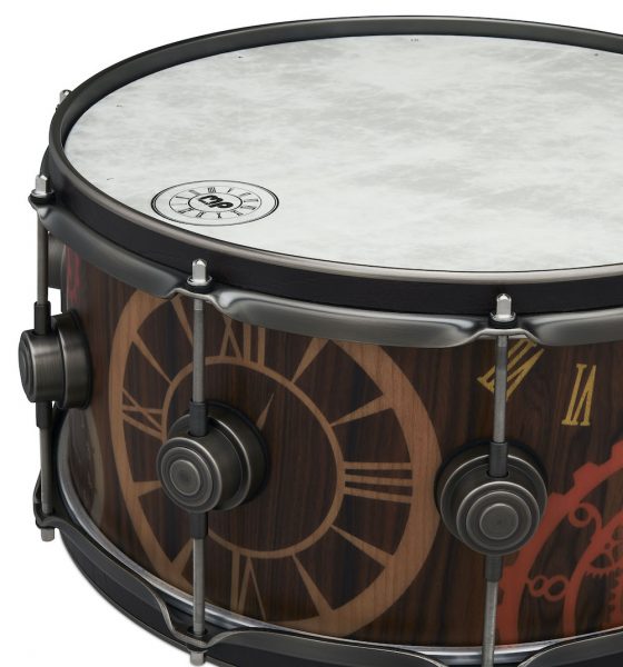 El nuevo tambor de DW está decorado con incrustaciones de madera “Clock and Gear”, con 351 piezas individuales, para ser exactos. Cada pieza de material teñido cortada a láser está meticulosamente incrustada a mano en la chapa superior de 1/36” de espesor de una carcaza Pure Purpleheart.