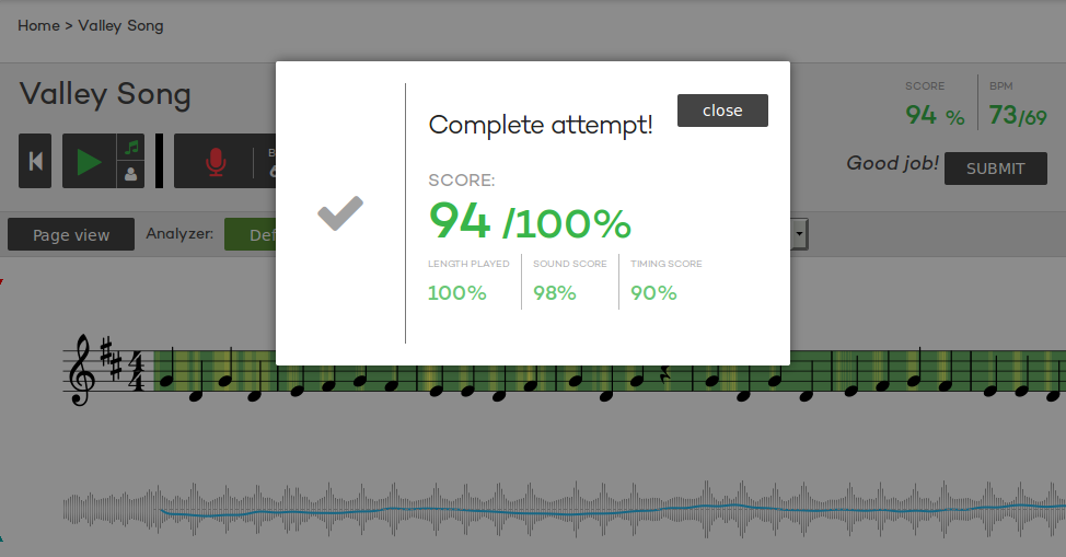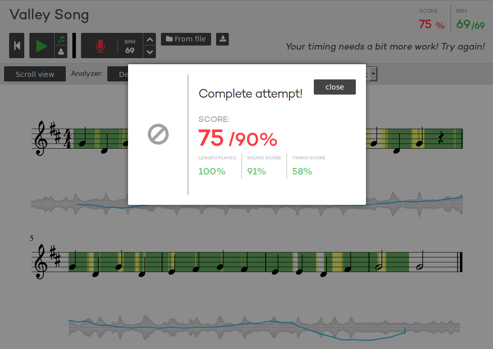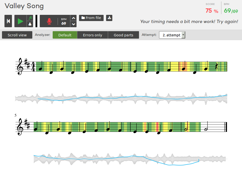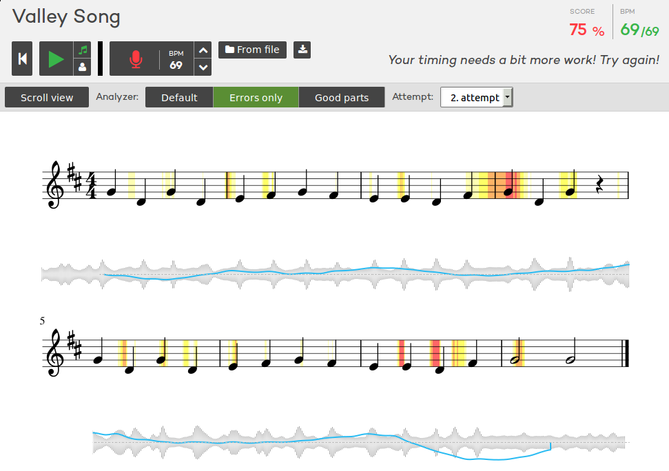 Accesible desde cualquier dispositivo con disponibilidad para Internet, PracticeFirst les permite a los estudiantes practicar en cualquier momento y en cualquier lugar con una flexibilidad y feedback instantáneo. Ideal para prácticas de bandas, orquestas y corales, PracticeFirst, alimentado por la tecnología de MatchmySound, les da a los profesores una herramienta fácil de usar para crear tareas que sean generales o individualizadas para cada estudiante. Las evaluaciones y el feedback son instantáneos.