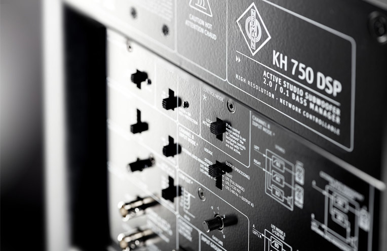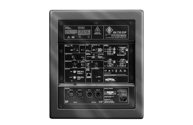 El KH 750 DSP tiene un manejo del bajo flexible 2.0/0.1 que le permite ser usado en diferentes configuraciones. En su panel posterior posee salidas y entradas análogas y digitales, cuatro modos de enrutamiento y controles de acústica. La aplicación para iPad Neumann.Control da acceso a varias funciones adicionales dentro del subwoofer.