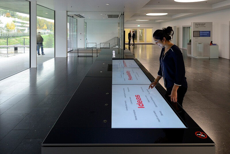 Más de 400 personas trabajan en el desarrollo de nuevas ideas en el Centro de Innovación de Hilti, donde, tras el proyecto de modernización, ahora hay una exposición centrada en “Innovación de Hilti”. Los módulos interactivos dan vida al espíritu inventivo de los desarrolladores e ilustran las soluciones creativas. Las ideas y el proceso de desarrollo, así como las etapas de planificación sistemática, los factores involucrados y los desarrollos de producto, se visualizan en una larga pantalla táctil. Los videoclips complementan las líneas de desarrollo y llevan a los visitantes a una visita interactiva y virtual al nuevo Centro de Innovación.