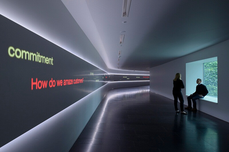 El túnel peatonal que conecta el edificio principal con el Centro de Innovación también ha sido ajustado con la instalación de medios. Una tira de luz continua con efectos de iluminación dinámicos visualiza la filosofía de la compañía mostrando términos memorables. La instalación utiliza tiras LED monocromáticas controladas y programadas por DMX. Cuando los términos no están iluminados, son invisibles detrás de la cubierta de material mineral. Aumentar y disminuir la intensidad de la luz a diferentes intervalos simboliza el dinamismo de la empresa.