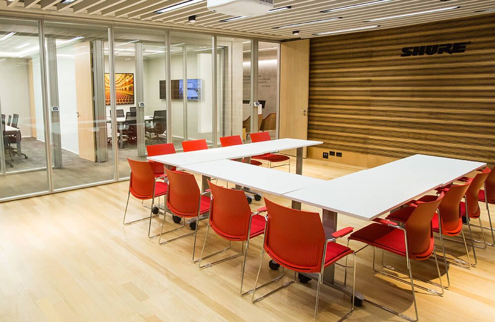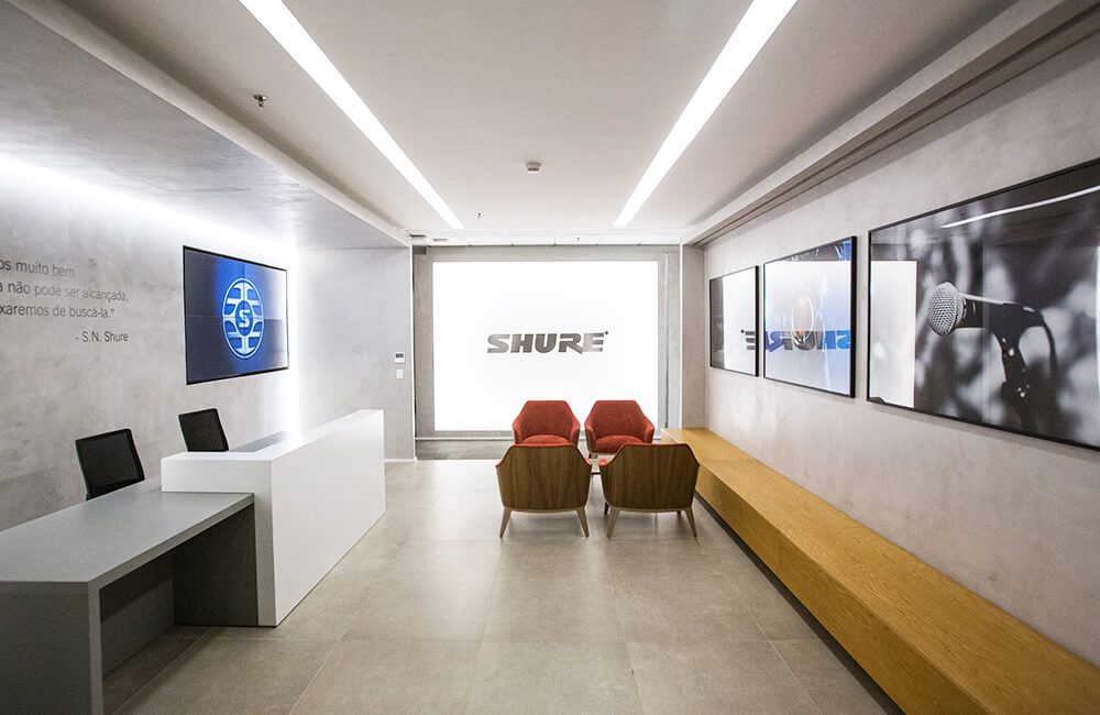 Cada decisión de construcción y detalle arquitectónico de la oficina de Sao Paulo han sido planeados pensando en el cliente. Al ingresar al espacio de 822 m², el cliente encuentra el Centro de Experiencias, que consta de cuatro áreas diferentes. La Sala de Música destaca la gama de productos como micrófonos, audífonos y sistemas inalámbricos que normalmente se encuentran en las tiendas autorizadas Shure. Esta sala también exhibe las distintas herramientas promocionales disponibles para todos los distribuidores autorizados. La Sala de Juntas y la Sala de Conferencias de última generación integran las soluciones de conferencia audiovisuales Microflex Advance y Microflex Wireless. Finalmente, la Sala de Capacitación, construida con tratamiento acústico, es un espacio íntimo y versátil que se puede convertir fácilmente desde un escenario hasta un estudio y salón de clases.