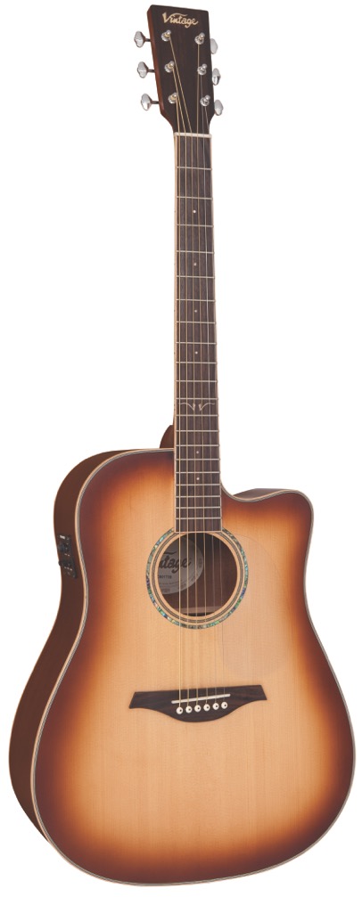 Las guitarras Vintage VEC501 Electro-Acoustic Cutaway Dreadnoughts utilizan las mismas maderas tonales y construcción clásica que su contraparte acústica. Los modelos electroacústicos VEC501 vienen con las pastillas undersaddle Sonicore de Fishman y el sistema Isys + preamp con jack estándar de ¼” y salida USB, de forma que pueda conectarla directamente a una computadora o dispositivo compatible con USB.